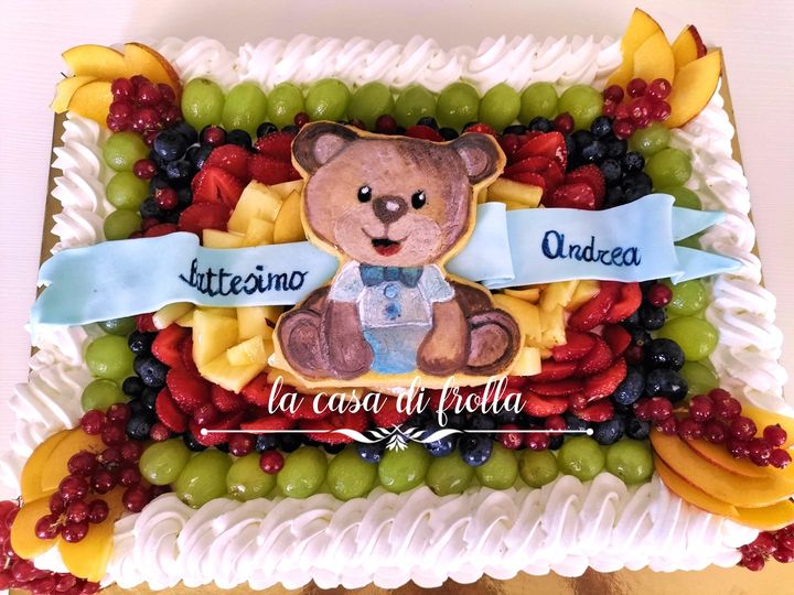 Una grande festa per celebrare la vita, quella per il suo battesimo, una occasione per riunire attorno a lui gli affetti più cari.Per questo giorno speciale una torta colorata che profuma di estate. Due sottili strati di cake alla vaniglia racchiudono in goloso ripieno di mousse al limone, stuccata con panna fresca e tanta frutta. l'orsetto è stato dipinto a mano su frolla.
